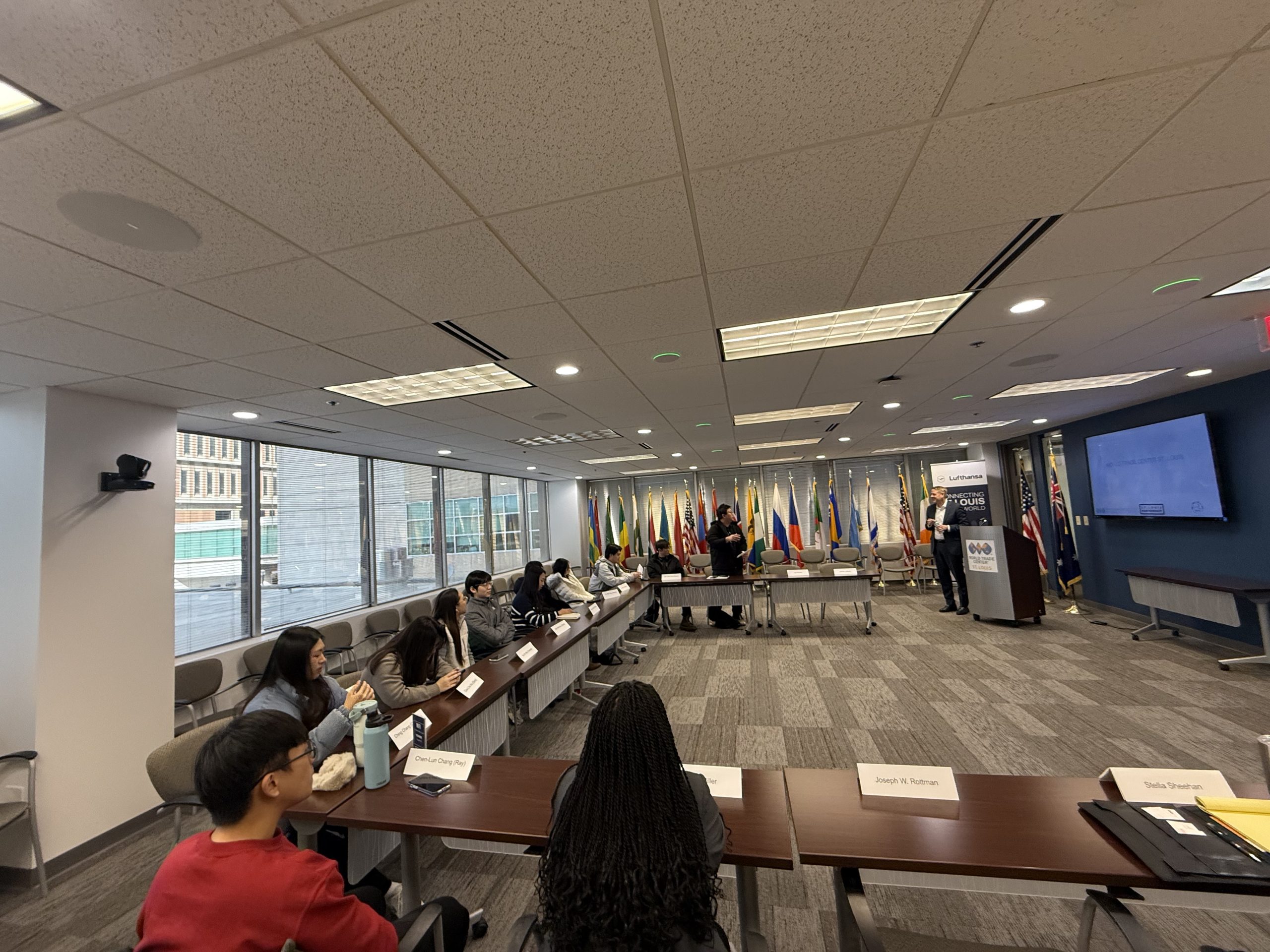 The students and two staff members, Renita Miller and Dr. Joe Rottman, visited WTC where they were given presentations by WTC Executive Director Tim Nowak, Deputy Director Stella Sheehan and Program Manager Annie Mbale explaining the work of STL Partnership, WTC and the St. Louis Mosaic Project, plus the value of the St. Louis Sister Cities Program.